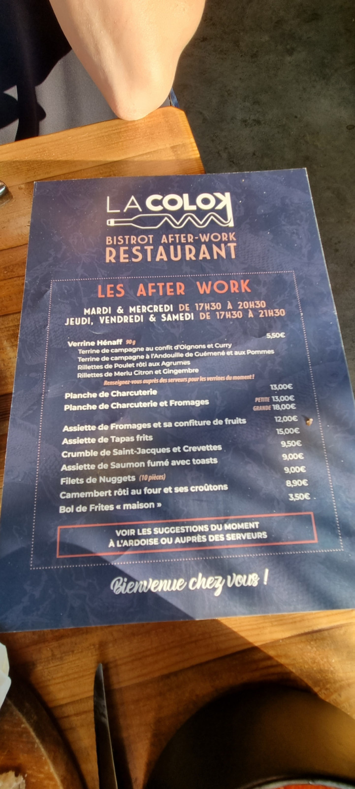 Plats uniquements le midis, la Colok propose en soirée des tapas en mode After-Work, carte des boissons assez fournie, mais coté Tapas, peu de choix, et il faut aimer la viande, le fromage et les frites !
